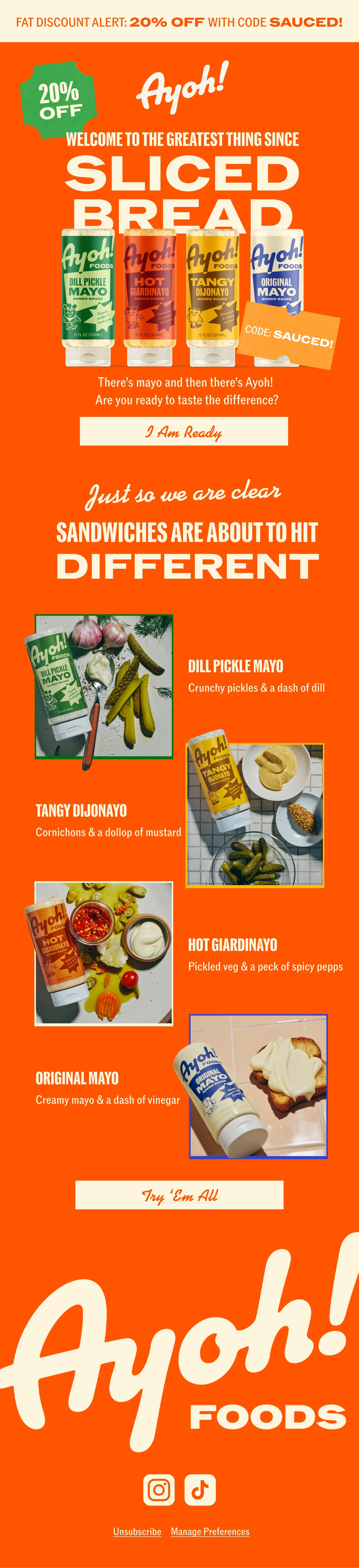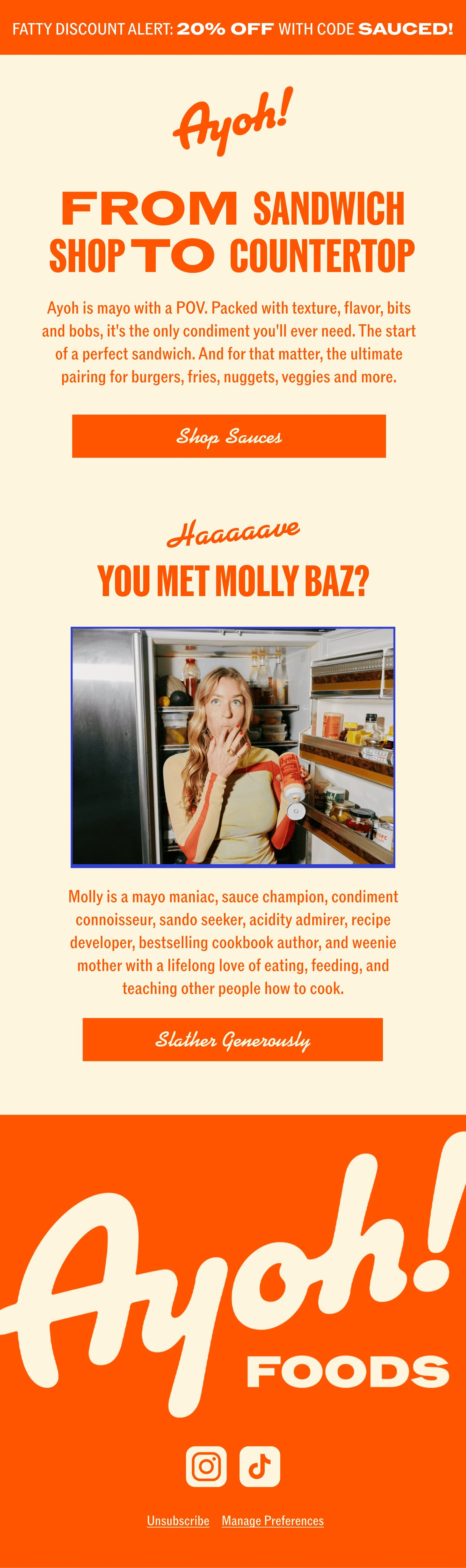 For Ayoh!’s launch, I worked directly with founder Molly Baz to lead the creative direction for go-to-market assets and social campaigns. Partnering with a strategist and copywriter, we built a cohesive set of lifecycle emails, Meta ads, and social creative that carried a consistent visual language across channels while leaving space for lo-fi creator content to add authenticity. The mix of polished design with approachable creator assets made the campaign both elevated and relatable, helping us cut through a crowded holiday season and connect with customers at scale